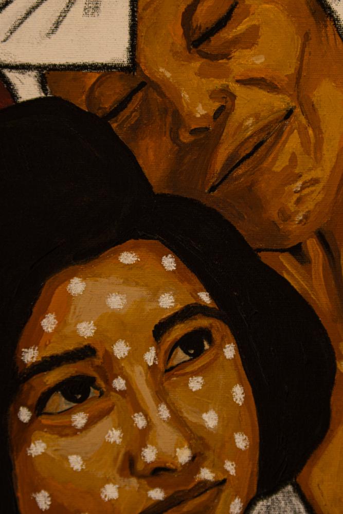 Obras misturam tinta acrílica, carvão, pastel oleoso e outros materiais expressivos