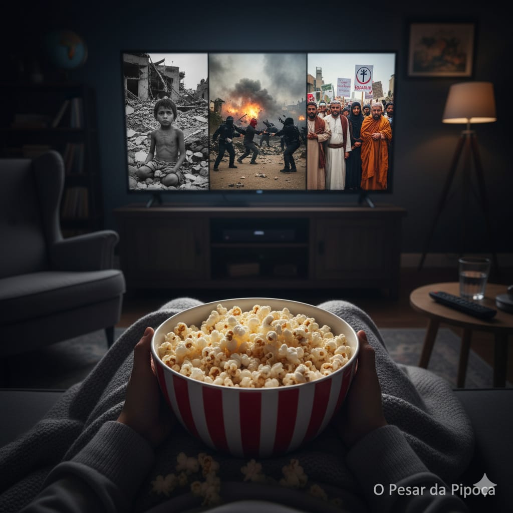 Aqui, na penumbra morna da sala, o aroma da pipoca paira como um bálsamo. Lá, na tela de alta definição, os rostos se contorcem em desespero: a poeira da bomba, o olhar vazio da fome, a fila da corrupção que nega o pão. Um clique no controle, e o grito de guerra se transforma em um jingle de refrigerante. Outro clique, e a criança desnutrida em Gaza dá lugar ao sorriso plastificado de um apresentador.