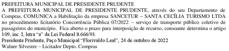 A Prefeitura de Presidente Prudente comunicou, na edição desta terça-feira do Diário Oficial do município, a habilitação da empresa Sancetur (Santa Cecília Turismo) no procedimento licitatório para a contratação definitiva da nova concessionária do serviço de transporte coletivo municipal.