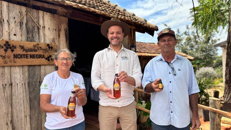 Matilde e Geraldo Maraffon, proprietários do Apiário Noite Negra, junto com Júlio Moraes