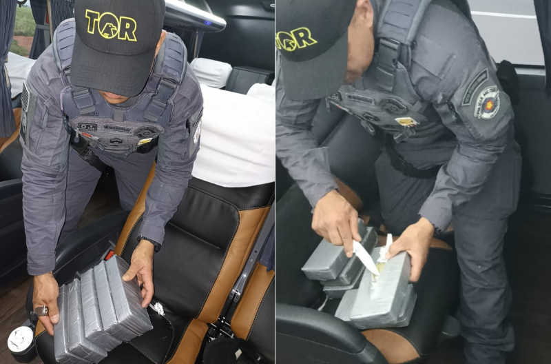 Durante a fiscalização no compartimento interno do veículo, dois bolivianos, 21 e 36 anos, apresentaram respostas desconexas sobre a viagem, o que motivou a vistoria das poltronas que ocupavam, nas quais foram localizadas, dentro dos assentos, entre as espumas e os forros, cinco tabletes de pasta base de cocaína, que totalizaram 5,3 quilos.