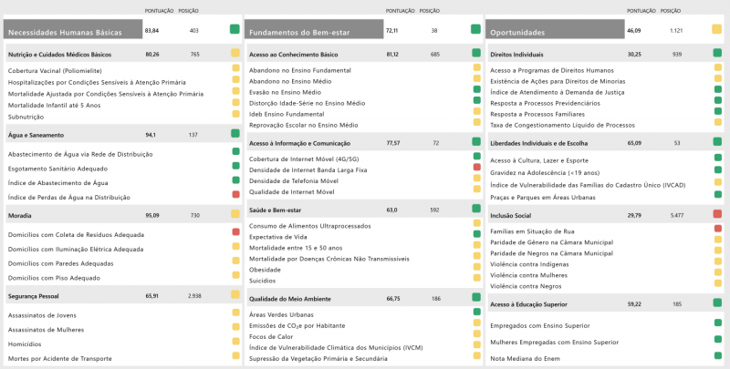 Última dimensão, “Oportunidades” apresentou farol amarelo (46,0/1.121), com três componentes em verde: Direitos Individuais (30,25/939), Liberdades Individuais e de Escolha (65,09/53), e Acesso à Educação Superior (59,22/185). Inclusão Social (29,79/5.477), no entanto, ficou no vermelho.