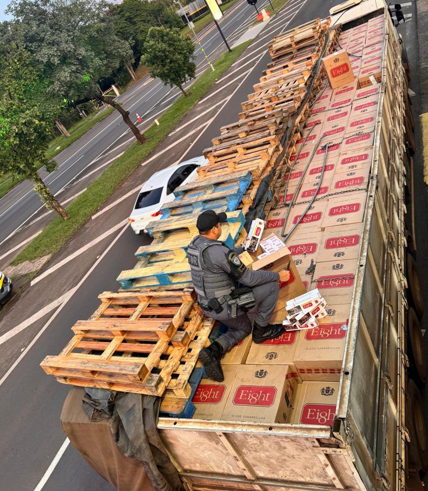 Um carregamento de 350 mil maços de cigarros de origem estrangeira, sem comprovação fiscal, avaliado em aproximadamente R$ 1.750.000,00, foi apreendido pela Polícia Militar Rodoviária, nesta terça-feira, em Pirapozinho.