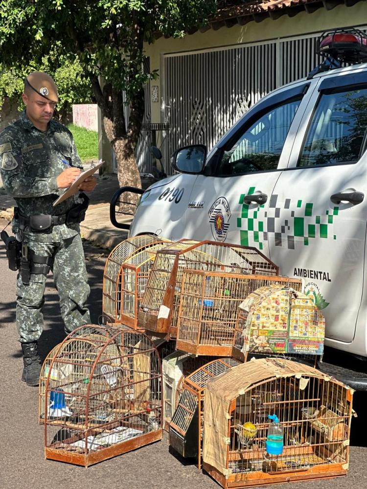 A Polícia Militar Ambiental aplicou multas que somaram R$ 9 mil a um morador do bairro Watal Ishibashi, em Presidente Prudente, que mantinha em cativeiro 17 aves silvestres, sem autoridade de órgão competente. Em fiscalização na residência do envolvido, 38 anos, que responderá criminalmente pelos seus atos, os patrulheiros localizaram sendo seis trinca-ferros, oito coleirinhos, um canário-da-terra, um pássaro-preto e um curió. “Cabe salientar que, dentre as 17 aves, havia uma da espécie coleirinho, em um alçapão, sendo utilizada como ‘chama’”, ressalta o policiamento ambiental. As aves, todas apresentando estado bravio, foram soltas em seu habitat natural. As gaiolas e o alçapão foram destruídos.