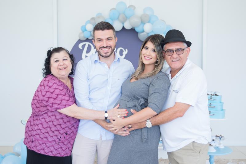 Lorraine Alves Marcelino com o marido Marcos Cardoso Marcelino, e os pais dela, Sidney José Alves, e Rosa Maria, curtindo o chá de bebê do primeiro neto, Pedro