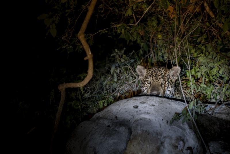 A partir disso, os fotógrafos ficaram entocados para não perder o momento em que a onça retornaria para reaver seu alimento. Foram praticamente seis horas de tocaia até o felino surgir e ser registrado pelas lentes. “Foi uma sorte fotografar essa cena ao vivo, pois há poucos registros feitos dessa forma. Existem pessoas que conseguem documentar com câmeras trap [equipamentos com sensor de movimento que fotografam automaticamente], mas nós estávamos lá no exato momento, a praticamente 10 metros do animal”, observa.