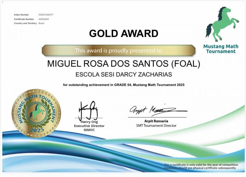2. Medalha de ouro na Mustang Math Tournament: Um feito notável, sendo Miguel o único brasileiro a conquistar o ouro em todas as categorias e grades da competição.