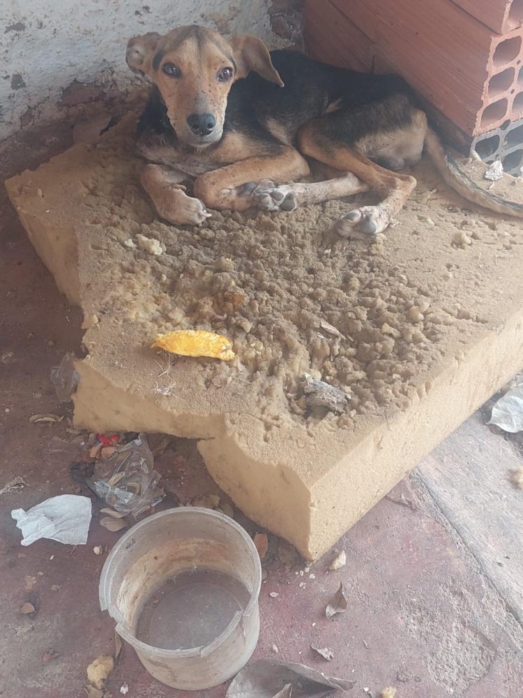 Sem alimentação, água, cheio de carrapatos, urina, mau cheiro... abandonado à própria sorte