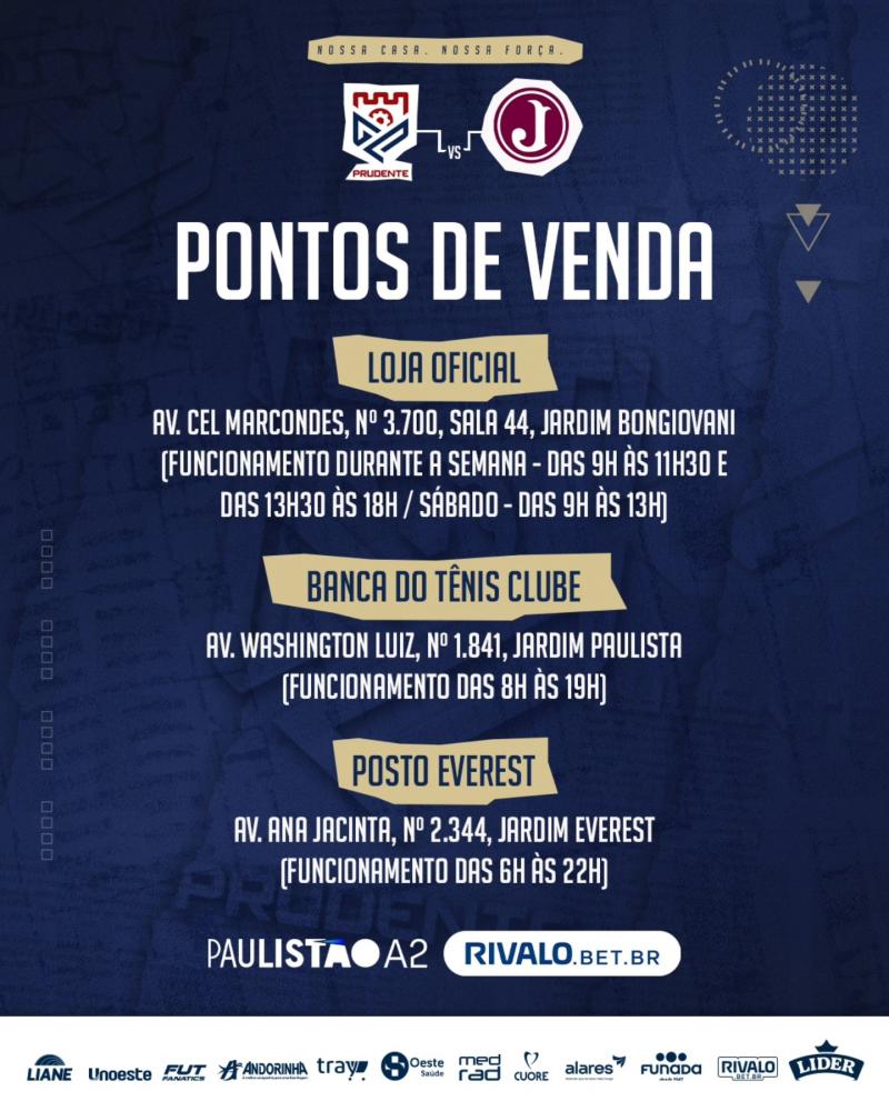 Os lotes promocionais, com valores reduzidos na compra antecipada, são válidos até as 13h do dia do jogo, em três pontos de venda: Loja Oficial do Grêmio Prudente (Avenida Coronel Marcondes, 3.700. Sala 44. Jardim Bongiovani), Banca do Tênis Clube e Posto Everest.