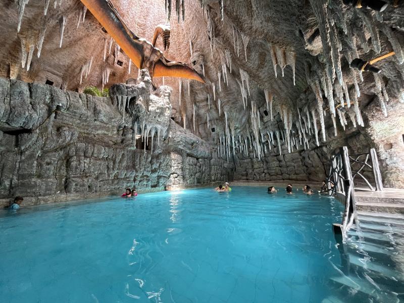 A caverna com piscina vulcânica e o pteranodon do vulcão Terra Parque