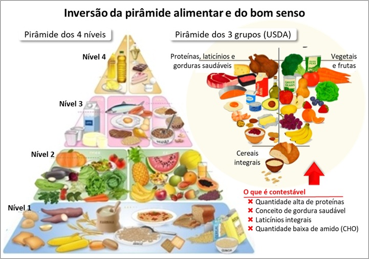 As pessoas nos EUA são as campeãs no consumo de alimentos ultraprocessados (donuts, xarope/melaço de milho etc), gorduras saturadas (carne vermelha, bacon etc) e das porções “extra big”, repletos de gorduras e açúcar, além de muita bebida alcoólica. Inverter a pirâmide enfatizando o consumo de carnes, ovos (+ bacon) e laticínios integrais é trocar seis por meia dúzia. Não são pão, batata, mandioca, milho etc, da base da “pirâmide clássica saudável” que provocam obesidade e doenças, como querem que a população acredite.