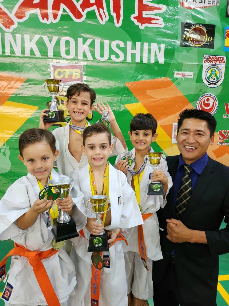 Alegria estampada nos rostinhos dos aratequinhas premiados no último fim de semana, juntos com o sensei Adilson Issami