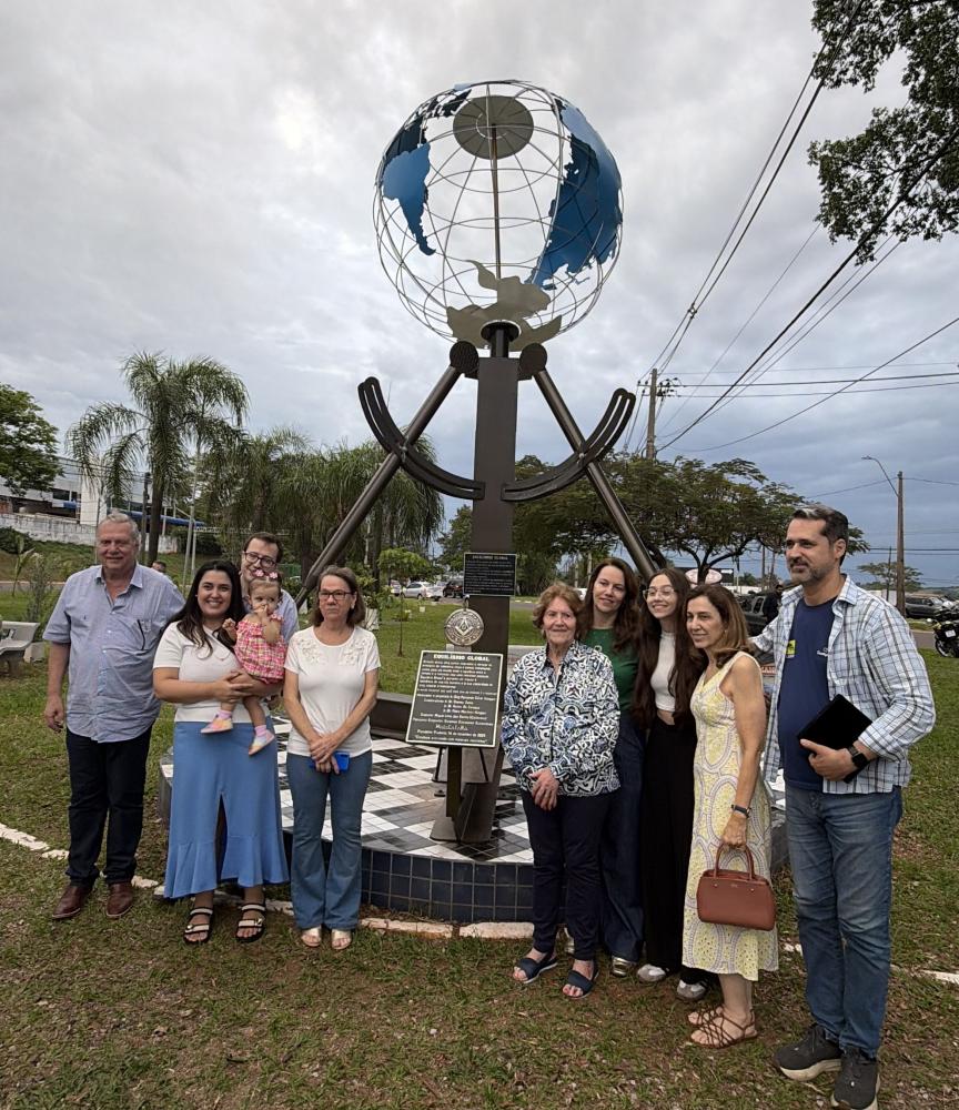 Família Hungaro diante da escultura sustentável “Equilibrio global” instalada no local
