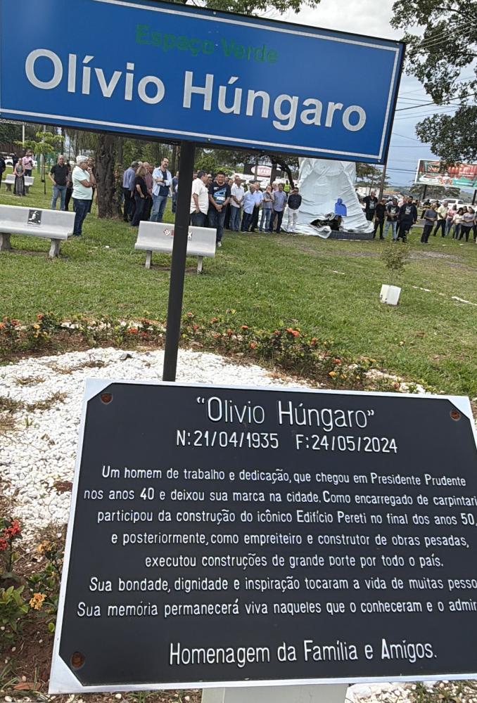 Presidente Prudente ganhou oficialmente um novo cartão-postal e espaço de homenagem na última sexta-feira. Foi inaugurado o Espaço Verde “Olívio Húngaro”, que abrange a movimentada rotatória das avenidas Salim Farah Maluf com a Juscelino Kubitschek. A área, adotada pela empresa Ecopontes – Sistemas Estruturais Sustentáveis, recebeu o nome do homenageado, que foi construtor e empresário de destaque na cidade.
