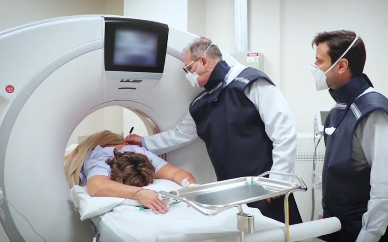 Foto: Cedida - Com base em tomografia, é posicionado fio marcador no centro do tumor
