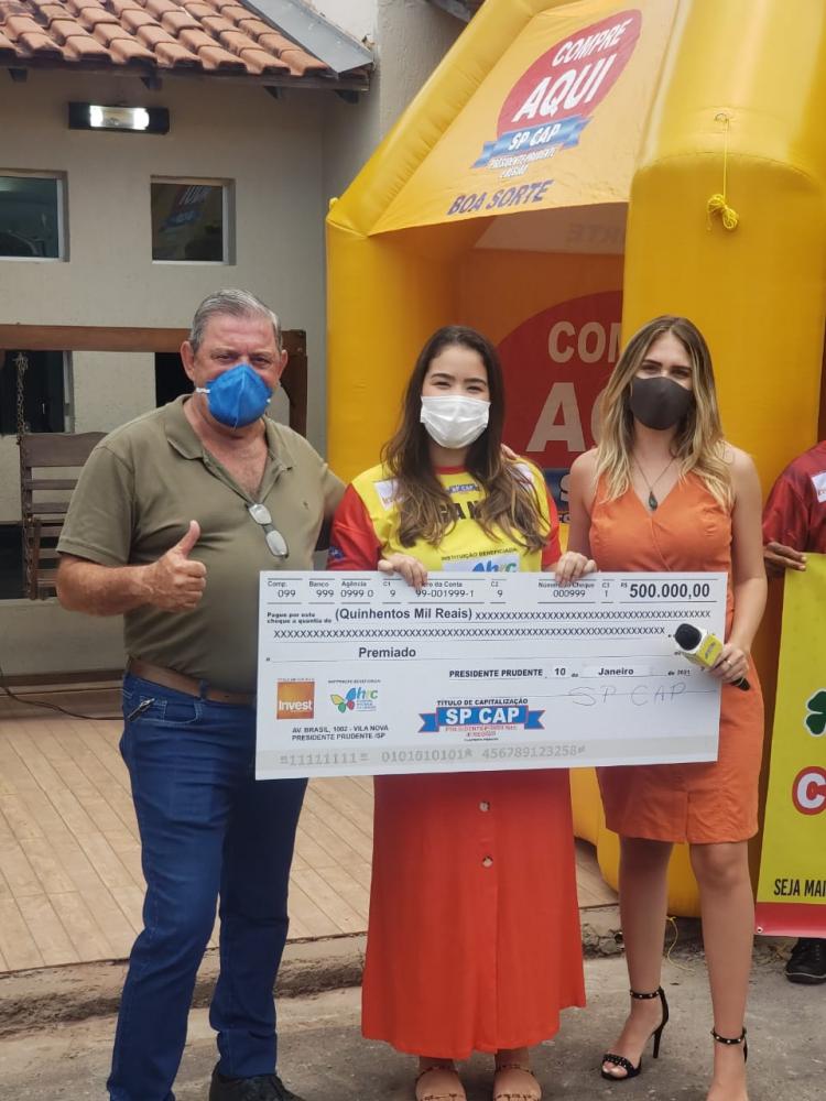 Francisco Lombardi e Tati Piovani, do SPCap, entregaram o cheque simbólico para Ana Beatriz Oliveira Morishita, moradora em Pacaembu, que ganhou R$ 500 mil, no sorteio do último domingo.