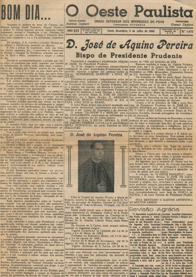 A redação do O Oeste Paulista, apresentando a S. Excia Revma. Dom José de Aquino Pereira, nosso novo pastor, a expressão humilde e singela, mas reverente e sincera, de seu mais profundo respeito, acatamento e submissão, faz ardentes votos no Céu para que se digne abençoar os trabalhos de S. Excia. Revma., fazendo-os frutificar centuplicadamente para bem da igreja, da pátria e de nova Diocese de Presidente Prudente."
