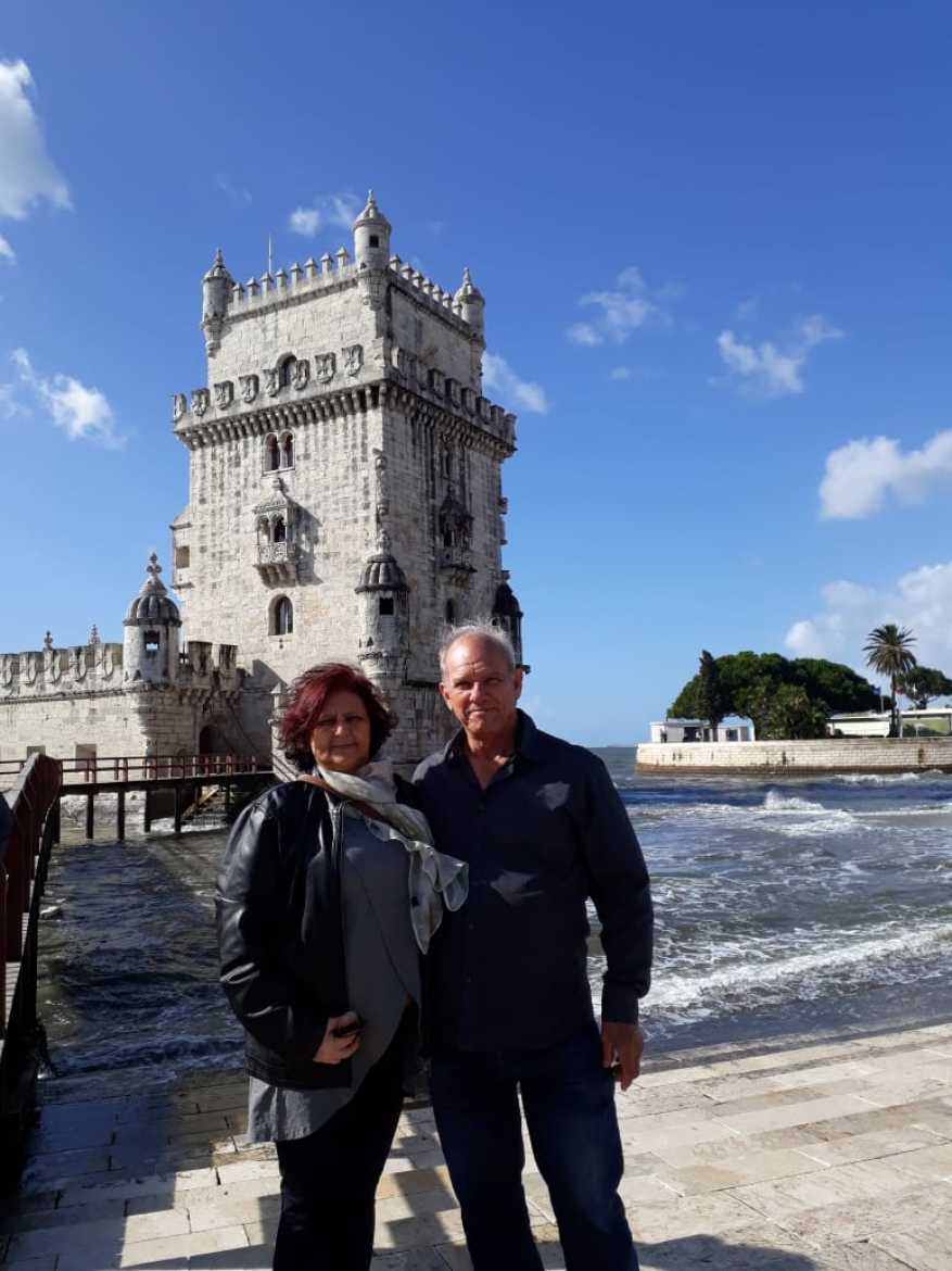 Maria Laerce e Antonio Bielli, diante da Torre de Belém, em Lisboa; casal passeou por Portugal, viagem programada pela agência Cacilda Tour