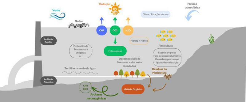 Conforme Marcelo Gomes da Silva, do Programa de Bolsas do Conselho Nacional de Desenvolvimento Científico e Tecnológico (CNPq), pouco se sabe sobre a contribuição da piscicultura nos processos de emissão ou remoção de GEE em reservatórios tropicais. Uma das principais preocupações associadas às fazendas de peixes está relacionada à liberação na água de substâncias consideráveis de matéria orgânica, provenientes de alimentos não consumidos e excrementos de peixes, que podem ser registrados em GEE. Os GEE produzidos em corpos d'água são transportados para a superfície principalmente por dois interruptores. No fluxo difusivo, os gases formados no sedimento e na água são transportados através da coluna de água para a atmosfera. O ebulitivo, originário de bolhas formadas no substrato, é liberado quando ocorre a inspiração da água ou quando uma bolha supera a pressão hidrostática, atravessando a coluna de água e sendo liberada para a atmosfera.