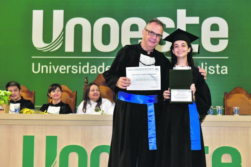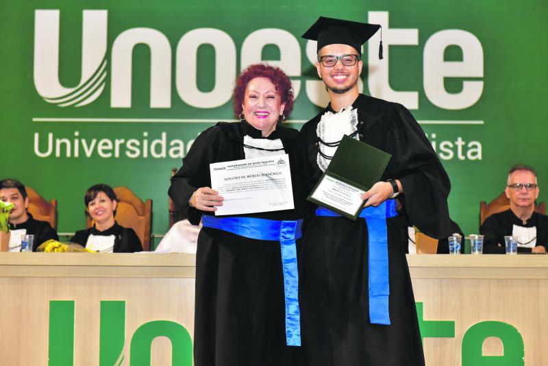 Coordenadora do curso de História da Unoeste, Alba Lucena entrega o título de melhor aluno da turma ao formando Leonardo Lima Breda
