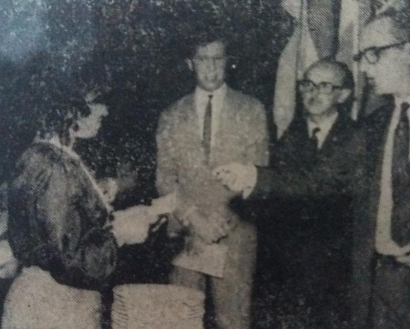 Em solenidade realizada no Teatro Municipal, domingo último, às 20h, a Liga Prudentina encerrou suas atividades de 1970, quando se realizaram a entrega de troféus e medalhas aos desportistas. (...) Na foto, Mario Artoni, representando o Crevima, com Barbosa e Claudio; e o repórter dos esportes amadores, Pacheco, recebeu o troféu do presidente da Liga, Alencar.