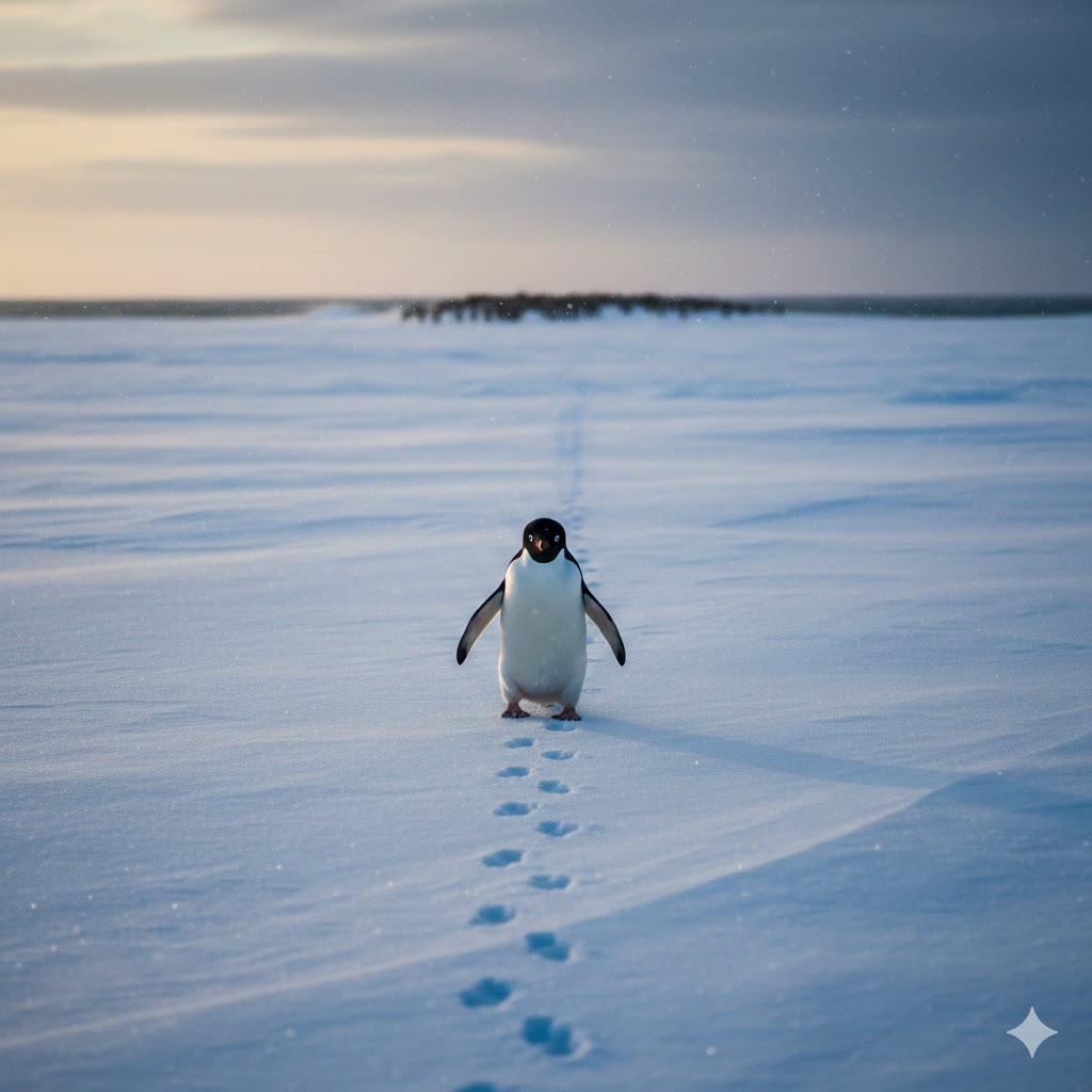 Meus pés, feitos para remar, agora batem contra o gelo seco. O som é diferente: um track-track rítmico, quase uma oração. Não há peixes aqui. Não há calor. Há apenas a linha reta.