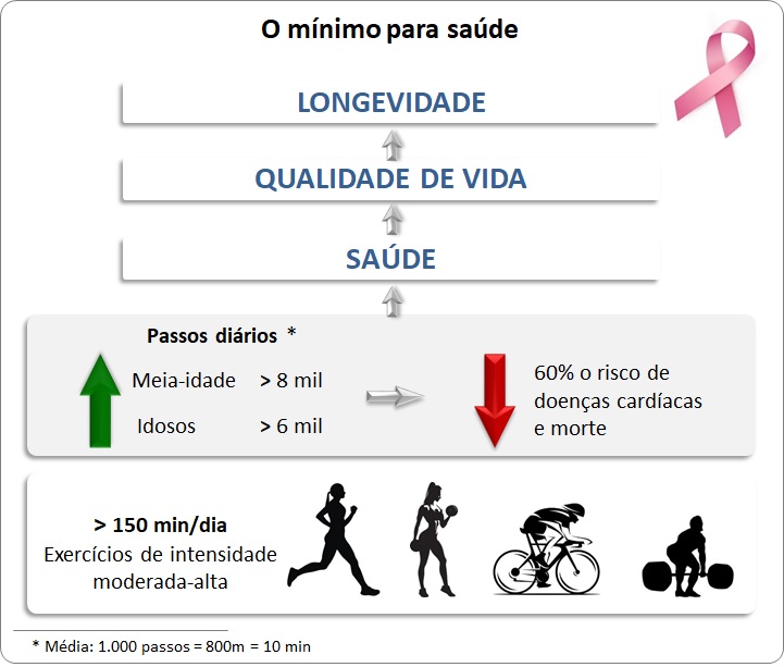 O mínimo para saúde são treinos de força e os “exercícios curtos” (snacks) de 30s a 2 min somados ao longo do dia. Estes dependem de uma mentalidade positiva e precisam ser consistentes. Além de reduzirem o risco de doenças e mortalidade, proporcionam benefícios periféricos, ou seja, algo além do objetivo principal. Melhora da qualidade do sono, redução da ansiedade e do estresse, busca por alimentação mais adequada e melhora do humor são alguns deles.