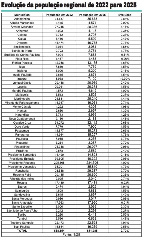 Presidente Prudente apresentou elevação acima da média de regional, marcada em 4%, saltando de 225.668 moradores, em 2022, para 234.706, neste ano. O mesmo ocorreu com a vizinha, Álvares Machado, com majoração de 4,18%, de 27.245 para 28.386 habitantes. O maior aumento populacional do oeste paulista, no entanto, que chegou a 19,90%, ficou para Irapuru, que foi de 5.938 para 7.120 residentes.
