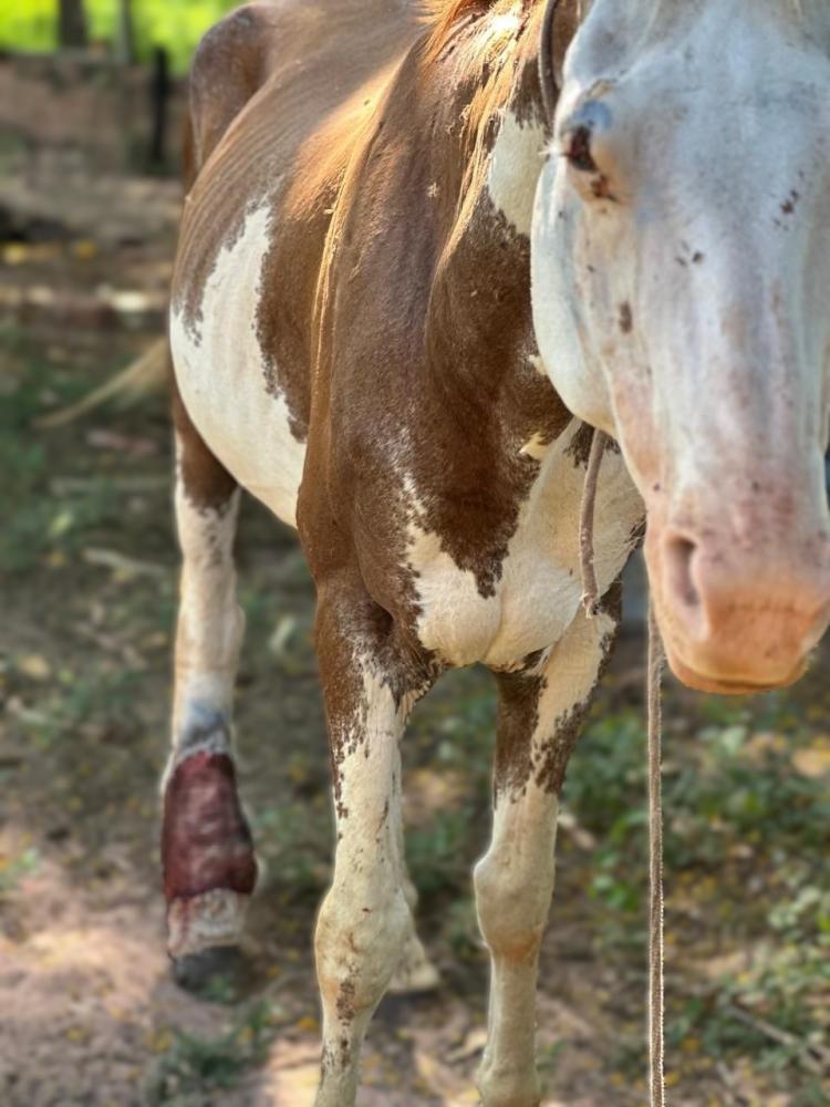 Um cavalo da raça Paint Horse, com grave ferimento em uma das patas traseiras e um corte acima do olho direito, foi apreendido pela Polícia Militar Ambiental, nesta terça-feira, em Martinópolis. Ele foi encaminhado para uma ONG (Organização Não Governamental) protetora de animais do município depois de ser apreendido em uma chácara cujo proprietário, 67 anos, foi autuado em R$ 3 mil por maus-tratos.