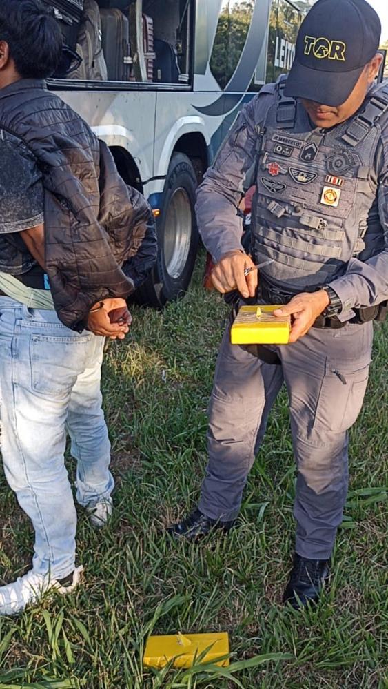 Durante a fiscalização, a mulher grávida demonstrou inquietação, segundo a Polícia Rodoviária, cujos patrulheiros decidiram por vistoriar suas bagagens no compartimento externo do veículo, nas quais foram encontrados três pacotes com dois tabletes e 496 cápsulas de pasta base de cocaína, prontas para serem ingeridas. Ela declarou que recebeu a droga também em Puerto Quijarro e desembarcaria em São Paulo, onde receberia R$ 5 mil pelo transporte da droga.