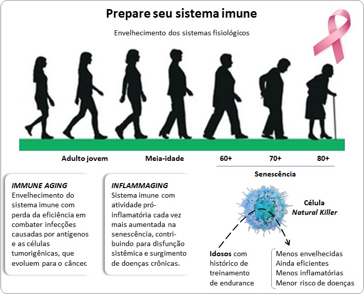 Estudo publicado em 2025 por pesquisadores da FCT Unesp e da Alemanha demonstrou que idosos (média de 64 anos) que realizavam treinamento físico de endurance nas décadas anteriores tinham o sistema imune (particularmente as células natural Killer – NK) mais eficiente do que os sedentários da mesma idade. As células NK não estão “envelhecidas”, respondem melhor aos antígenos e a resposta inflamatória para estímulos é menos exacerbada do que ocorre nos idosos sedentários, o que diminui o risco de doenças metabólicas. Por isso, treine os músculos enquanto é adulto jovem ou de meia idade para treinar também o sistema imune para a senescência.
