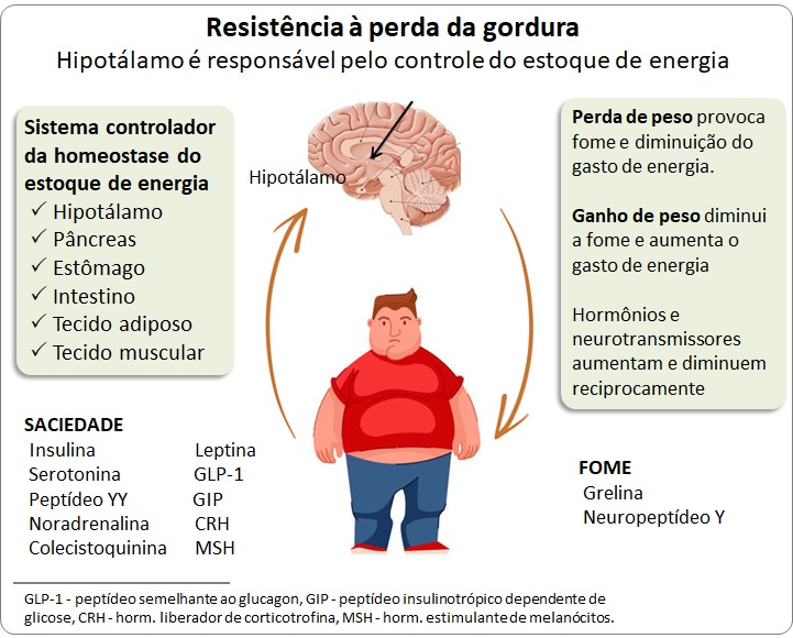 O hipotálamo possui neurônios responsáveis pela homeostase do estoque de energia. Esse “ponderostato” é um sensor da quantidade de energia (gordura) acumulada. Funciona ativando mecanismos para prevenir o ganho e a perda de peso. Alterações do estoque de gordura para mais (excessos alimentares) ou para menos (dietas restritivas) são percebidas e fazem o hipotálamo disparar mecanismos de correção: mais ou menos fome e maior ou menor gasto de energia.