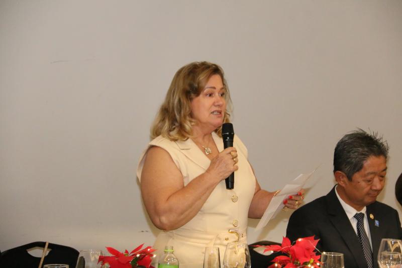 A presidente da Casa da Amizade, Lucimar Turuta, em seu discurso sobre o Natal