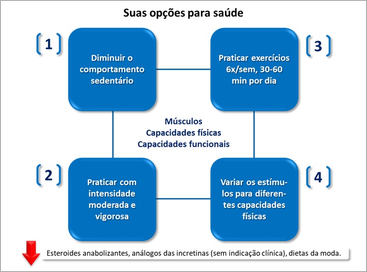 Se você busca saúde de forma natural, tendo ou não a necessidade de uso de medicamentos (doenças crônicas já instaladas), são quatro as providências para tomar: [1] diminuir o comportamento sedentário, [2] praticar exercícios 6 vezes por semana, 30-60 min por dia, [3] praticar com intensidade moderada e vigorosa, [4] variar os estímulos para diferentes capacidades físicas.