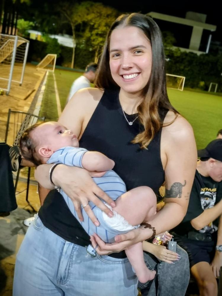 Mamãe com seu bebê foram prestigiar o papai jogar