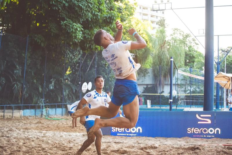 No centro da rede, Ramão Pardo, um dos professores do futevôlei do clube, durante uma das partidas