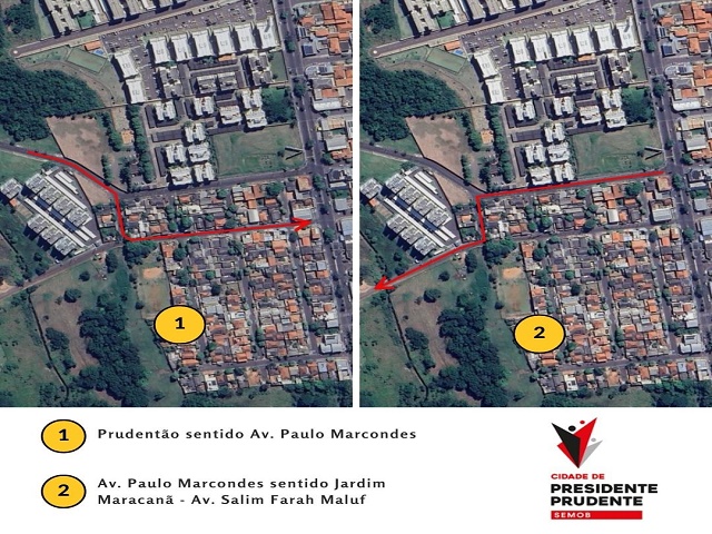 Também haverá mudança para quem sai do Estádio Prudentão sentido Avenida Paulo Marcondes e para quem sai da Avenida Paulo Marcondes sentido Jardim Maracanã/Avenida Salim Farah Maluf.
