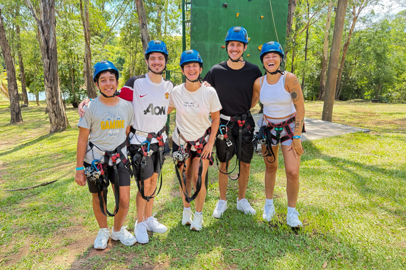 Os influenciadores PKllipe, Tuca e Marcela junto à família, prontos para participar do arborismo, esporte de aventura do Terra Parque)