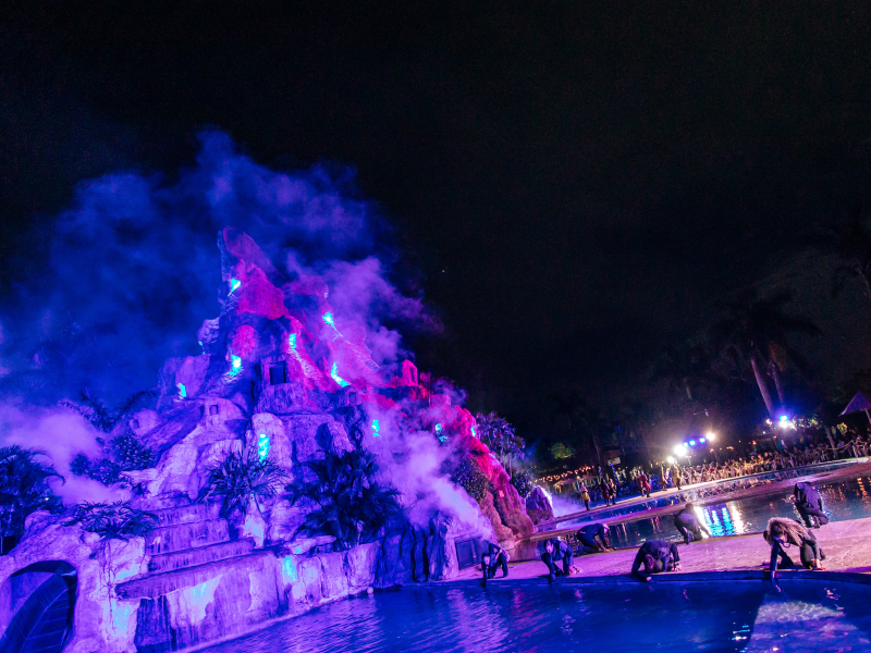 Quando a noite cai, o espetáculo começa. Ao anoitecer, o clima muda, a iluminação se transforma, a trilha sonora envolve o público e o silêncio do campo dá lugar à expectativa coletiva. Então, o vulcão desperta.